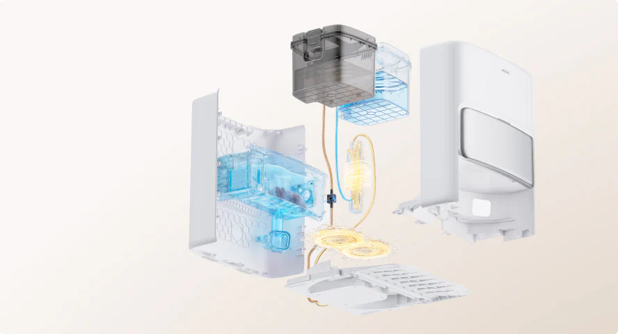 P50 Pro Ultra automatski čisti krpe i dasku za pranje rublja koristeći vruću vodu od 75°C (167°F)*, uklanja prašinu i ostatke do 75 dana te nadopunjuje vodu za brisanje s pomoću dovoljnog spremnika čiste vode od 4 l. Štoviše, robotski usisavač može također nadopuniti otopinu za pranje krpa i osušiti krpe vrućim zrakom od 45°C (113°F)* - sve u jednom doku.