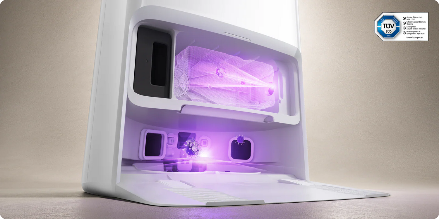 UV sterilizacija, učinkovito uklanjanje bakterija: Nakon samopranja mopa i sušenja vrućim zrakom, UV sterilizacija uklanja 99%* bakterija na njemu. Vrećica za prašinu također se UV sterilizira nakon automatskog pražnjenja, smanjujući bakterije za 99,98%.