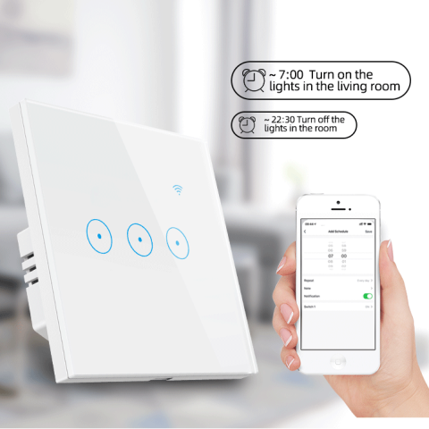 Pametni zidni prekidač za svjetlo povezuje se putem aplikacije Smart Life. Aplikacija vam omogućuje paljenje i gašenje prekidača gdje god se nalazili. Moderan dizajn i stakleni prekidači osjetljivi na dodir, savršeno će se uklopiti u vaš dom. Od sada više ne trebate brinuti jeste li ugasili sva svjetla u kući prije odlaska na put, jer to možete provjeriti gdje god se nalazili.