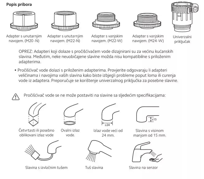 *Pročišćivač vode za slavinu ne može se postaviti na slavine sa sljedećim specifikacijama: četvrtasti ili posebno oblikovani izlaz vode, ovalni izlaz vode, izlaz vode veći od 24 mm, slavina s visinom manjom od 15 mm, slavina s izvlačnim tušem, tuš slavina i slavina na senzor.