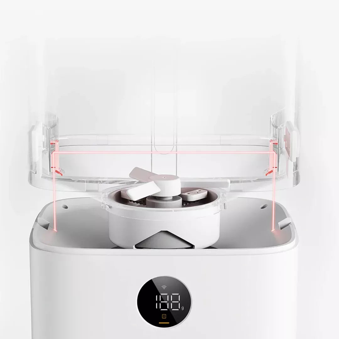 Ugrađeni infracrveni senzori neprestano prate preostalu razinu hrane u spremniku i putem LED zaslona i Mi Home aplikacije upozoravaju kada su zalihe hrane izrazito niske. Osim što LED zaslon smješten na prednjoj strani hranilice prikazuje upozorenja o niskoj zalihi hrane, na istom u stvarnom vremenu uvijek možete pogledati status hranilice ili težinu hrane koja se nalazi u zdjeli.